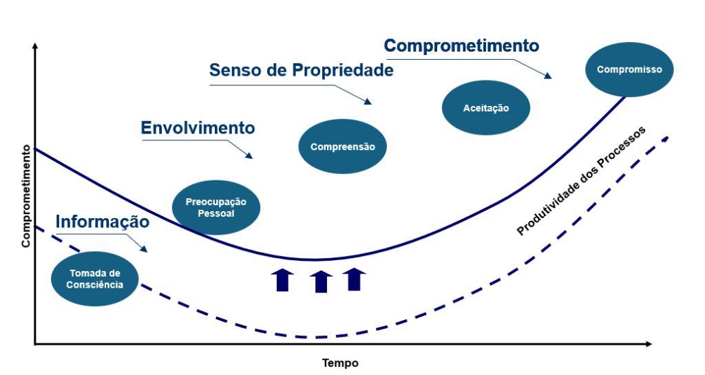 Desenvolvimento de uma estratégia de mudança que inclui comunicação, treinamento, suporte e gestão de resistências.